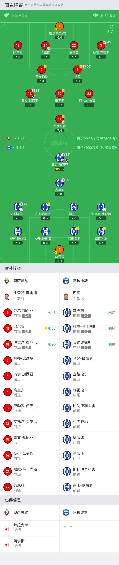 在西班牙足球甲级联赛第16轮比赛中,奥萨苏纳主场迎战阿拉维斯。开场仅1分钟,阿拉维斯就由卡洛斯-马丁助攻基克-加西亚打入一球,让奥萨苏纳手足无措。但是,奥萨苏纳并没有放弃,他们迅速展开反击,第54分钟,卡泰纳助攻布季米尔成功扳平比分,场上气氛一下子变得火爆起来。