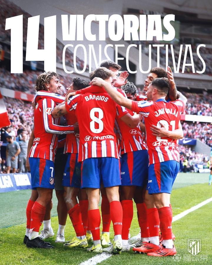 在西甲第19轮的比赛中,马德里竞技主场1-0险胜奥萨苏纳,取得了14连胜的辉煌战绩,这一成绩也使得他们创造了球队历史上最长的连胜纪录。自赢得本场比赛后,马竞在各项赛事中不败的状态已经持续了一个漫长的段落,他们在球场上表现得极为出色,一路高歌猛进,将对手们轻易碾压在脚下。